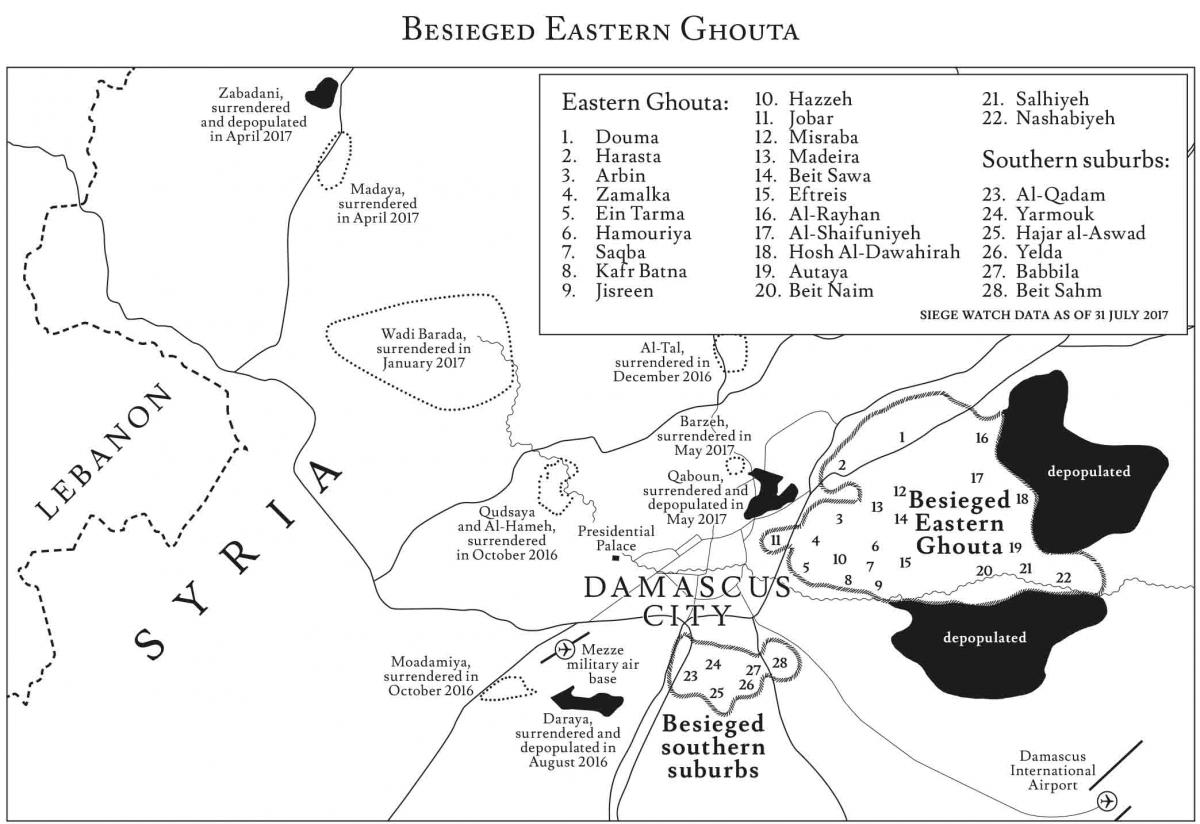 Eastern Ghouta is the largest besieged area in Syria. It is an agricultural region of 22 neighbourhoods with a total estimated population of between 376,000 and 425,000. Before the war, the population was more than 1.2 million.