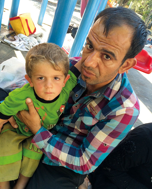 A father with his sick child camping in a playground in Bodrum