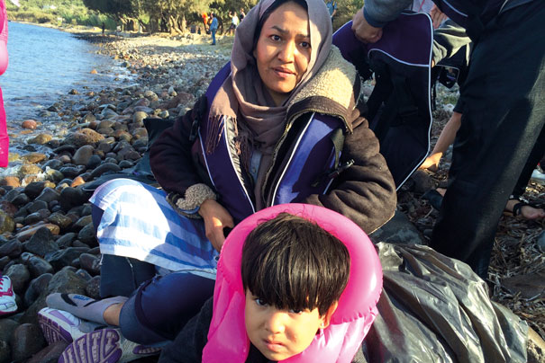 An Afghan woman and child arriving on Lesbos after crossing from Turkey