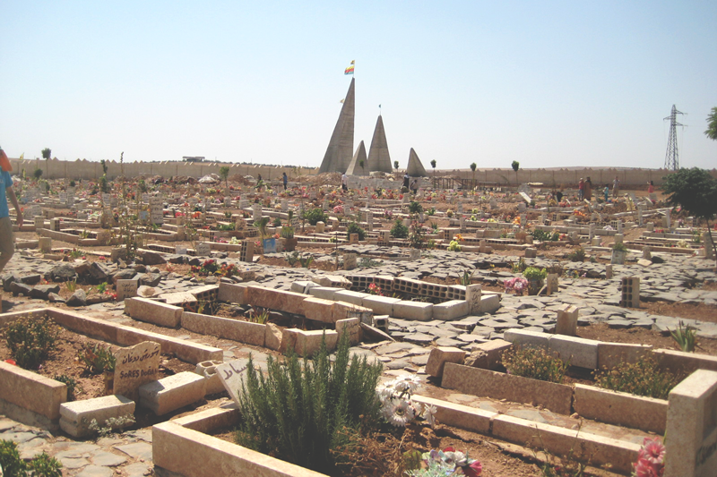 A graveyard in Kobane. The secular memorial is topped by four flags: YPG (yellow),YPJ (green), in the middle the Rojava flag and above that a flag depicting Abdullah Ocalan