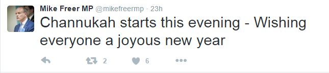 Mike Freer is Conservative MP for Golders Green, the heart of Britain's Jewish community. So on Sunday, naturally, he sent a tweet out to mark the start of Channukah.
